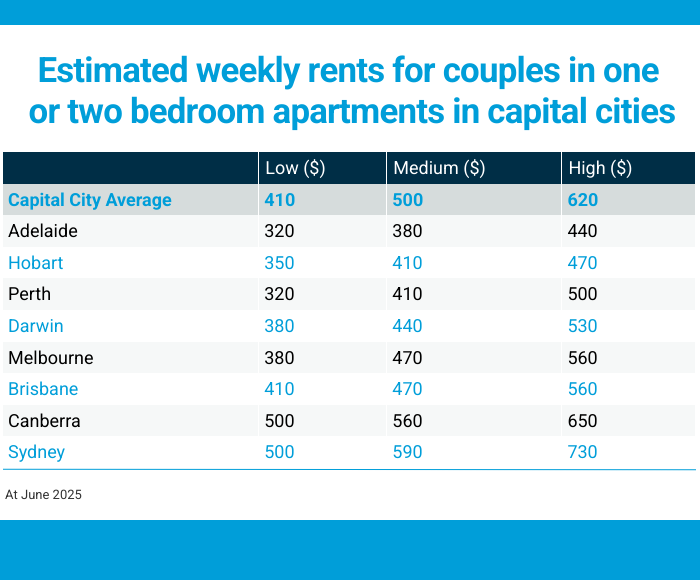 Estimated weekly rents for couples in one or two bedroom apartments in capital cities at June 2025