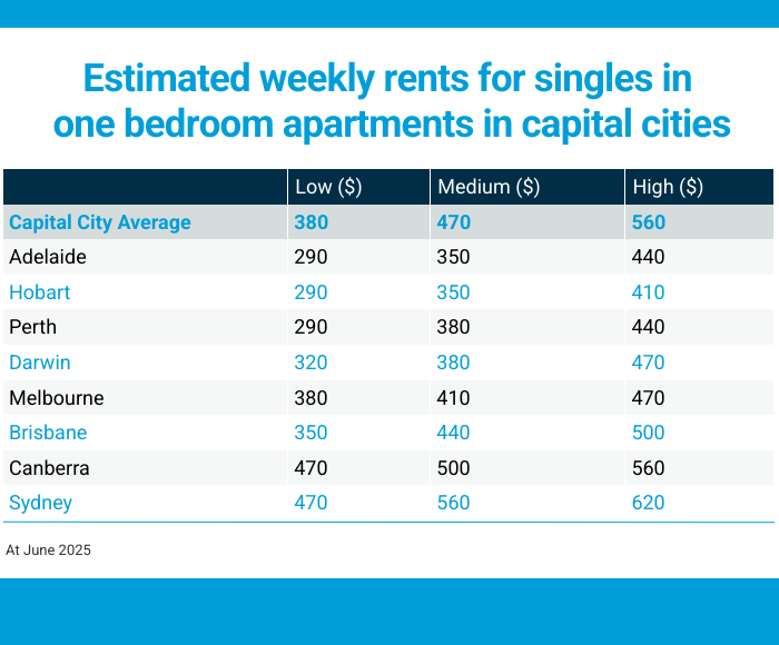 To keep things simple we assume single people rent one-bedroom apartments, and couples rent either a one-bedroom or two-bedroom apartments in capital cities. The typical one-bedroom rent across all capital cities averaged $470 per week in June 2025, with Sydney being the highest at $560 a week. In general Sydney and Canberra have higher rents than the average.